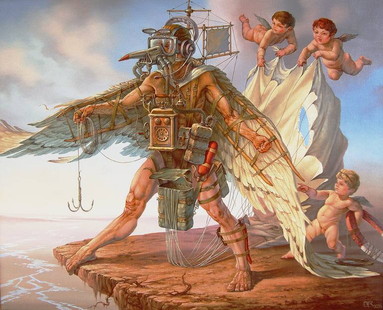 A surreal depiction of the mythological Icarus who wants to take off, but the author and guardian angels warn him of the danger of this idea.