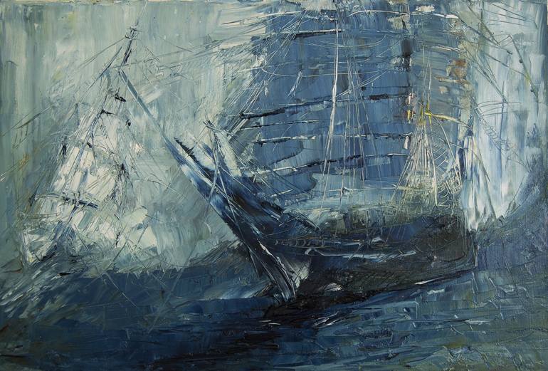 "Ice Storm" is a landscape painting, inspired by and old style ship called "velliera" in Italian, for which I am don't have an exact translation.