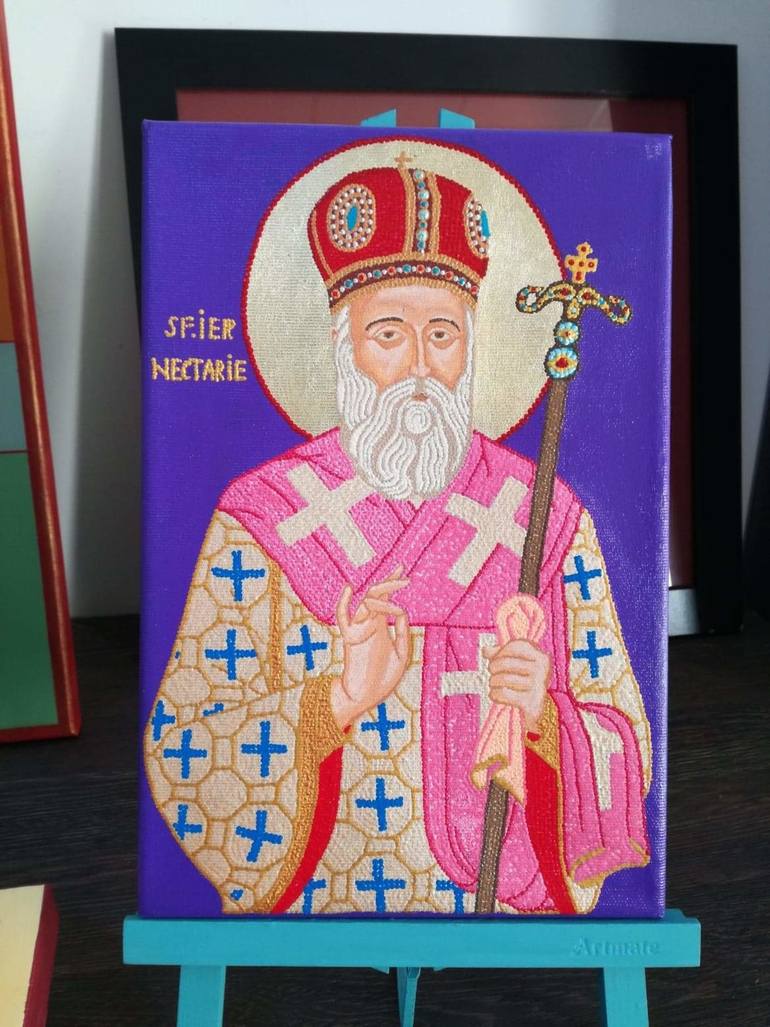 Icoana cu Sfantul Nectarie, pictata pe panza punct cu punct (pointilism) Culori acrilice