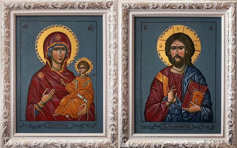 Wedding icon, canvas on cardboard, acrylic, decorative rhinestones. Framed Compositions of two icons: Christ the Savior and the Mother of God, which are used in the wedding ceremony for blessing.