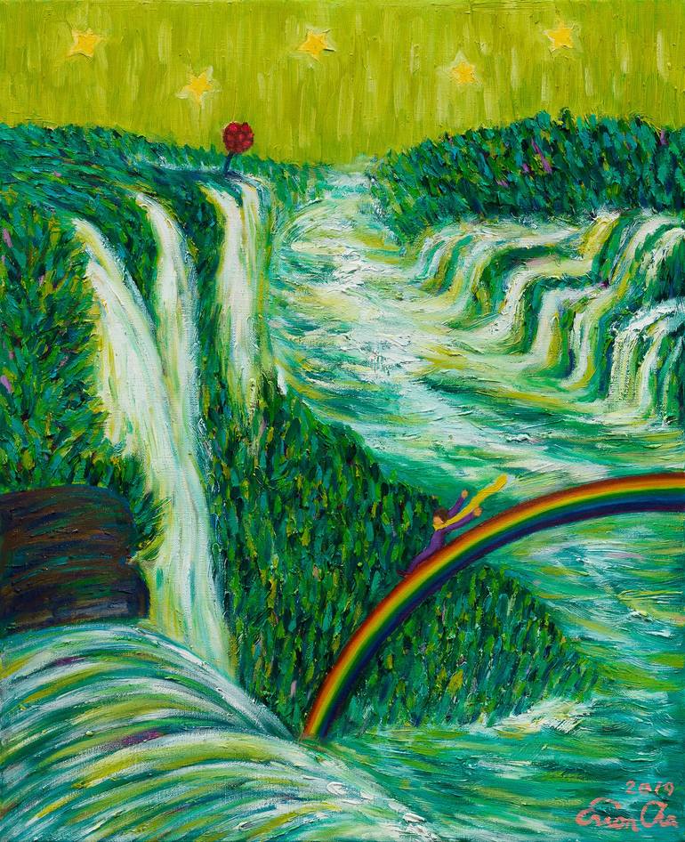 The Big Prince is riding down on a rainbow that is hung over the Iguassu Falls. His rose is looking at him from above.