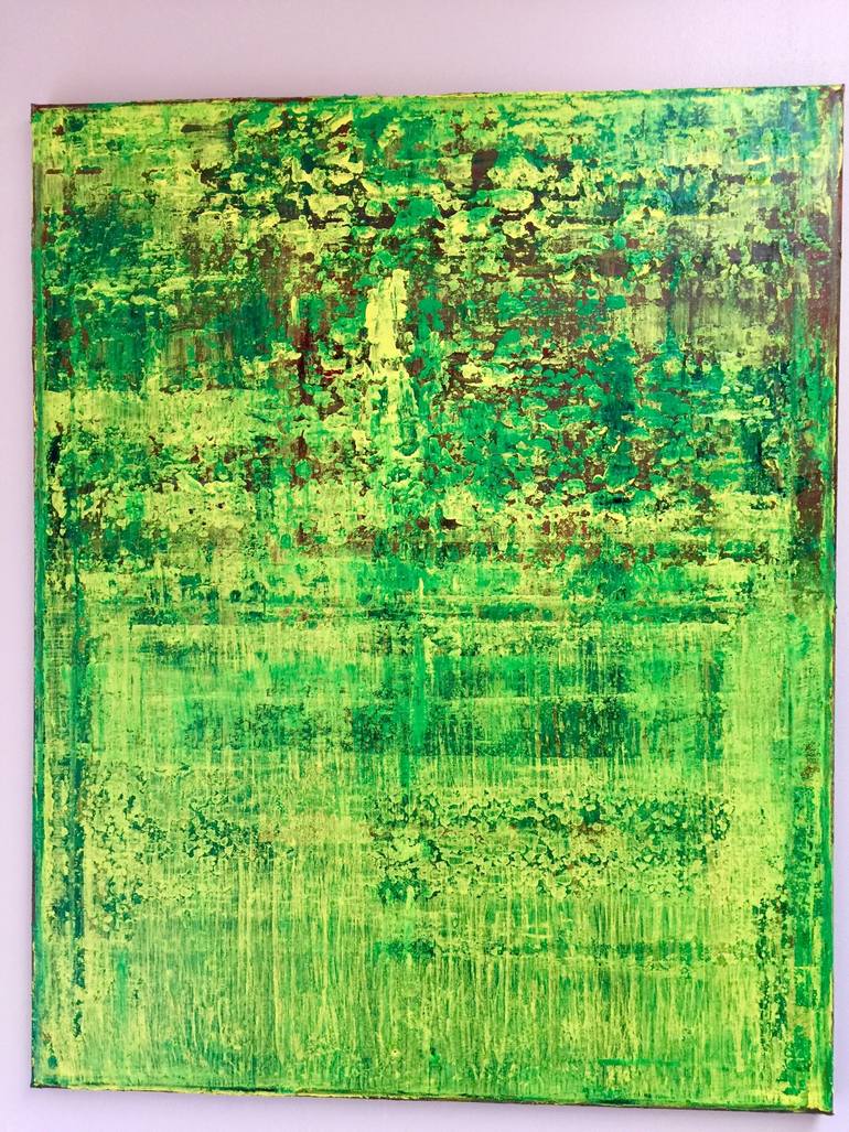 Original acrylic Gerhard Richter-inspired painting - Ijo* 24x30 by . The artist was inspired by nature and paddy fields during visits to Ubud, Bali. Happiness is the theme for this painting which will welcome you first thing in the morning.