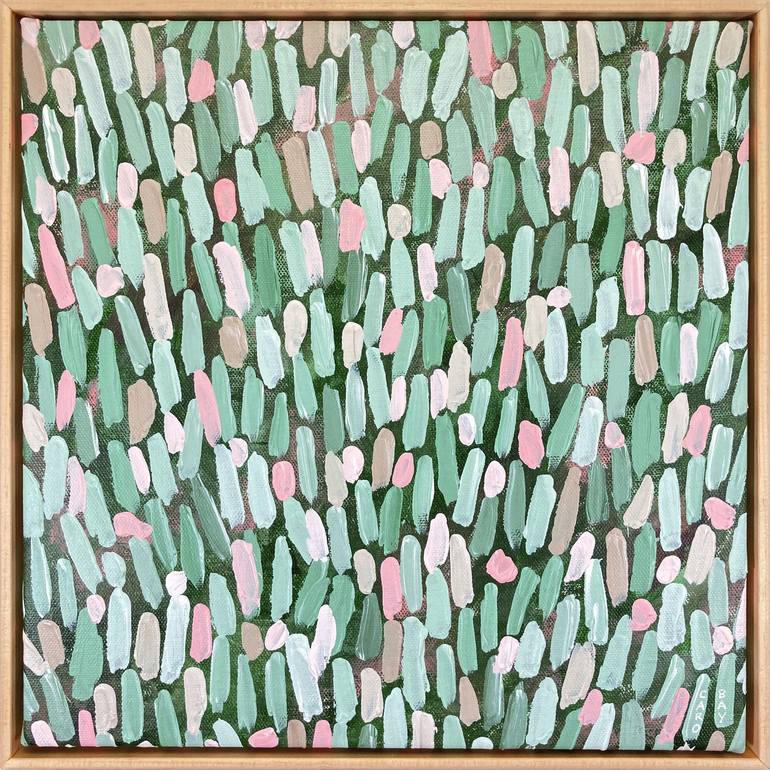 FRAMED / READY TO HANG Original painting on stretched canvas. Framed in a handmade floating wood frame. Abstract artwork painted in my “lines and dots pattern” style. Color palette Nature, botanical colors. Shades of olive and sage green, blush pink, beige. Style Abstract expressionism, bold mi...