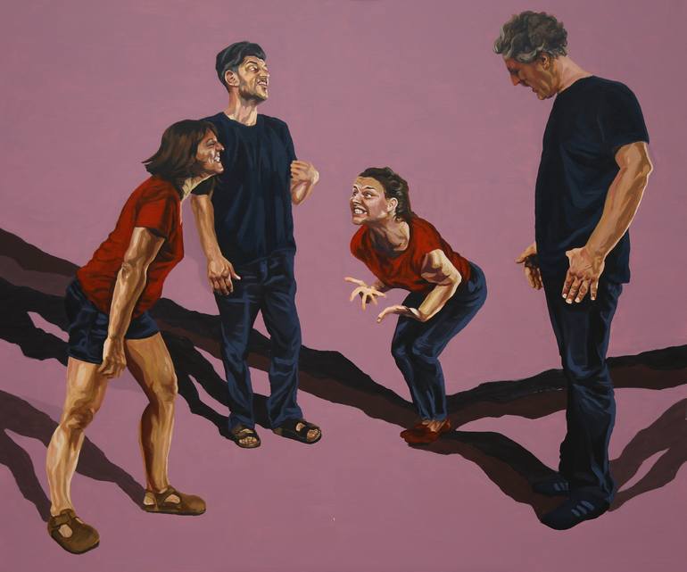 Scene inspired by missunderstandings and useless quarrels, part of the Illusions series about finding inner piece. Red and blue T-shirts colors metaphorically represent gender roles. Who we are and what are we defined by? Made in acrylic on canvas, ready to hang, signed on the back.