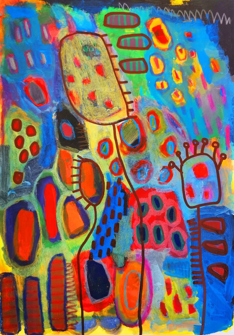 Imaginarium2 is a vibrant colorful painting, acrylic and oil pastels on paper. Fantastic plants and flowers on a bold colors background.