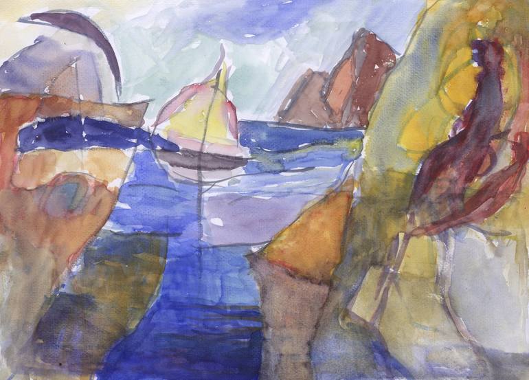My inspiration was my love for the sea. This is an imaginary seascape.I like working with color and especially watercolor which is a medium that helps to set free my imagination.
