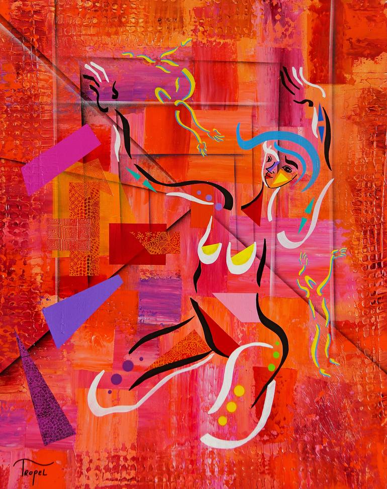 My approach focuses on body language and expression Touched by calligraphy I like to work on movement, gestures and lines. The deformation of the bodies makes it possible to release the essential. All my work is the illustration of my personal reflections on love, Life and Death but also on the hope that animates human beings and the relationships between them, while giving free rein to my imagination and creativity. I like to leave the audience with multiple possible interpretations I have not been in technical demonstration for a long time, but I orient my work towards suggestion. "I like playing on the delicate chord of emotions" "Painting can not be a simple coloring of a drawing" "I try not to weigh down the canvas with decor or accessories" "A esthetics are of little value to me, what I’m looking for is the strength or the power of a feeling" TROPEL mixes his emotions and his dreams to give life to unreal and improbable characters. "I love what movement does to the body. So I twist it, I attempt to bend it the way I want it and attempt to make the idea I want to give the spectator appear."