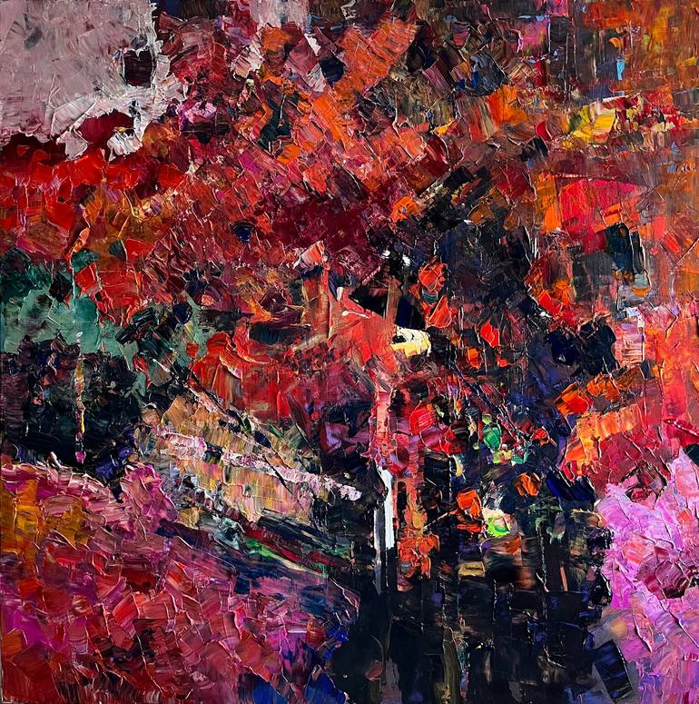 The painting titled "Immersion into an Autumn Forest" by Yuriy Vatkin is a vibrant and emotional abstraction capturing the atmosphere of autumn nature. The artist employs intense shades of red, burgundy, orange, and yellow, reminiscent of fiery foliage. Deep greens and blacks create depth and contra...