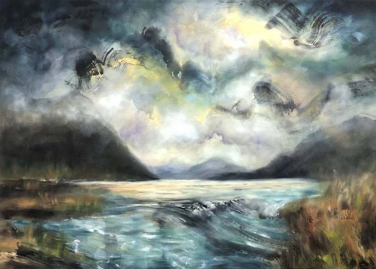 "Immortal" is an expressionistic mixed media painting created with oil paint and ink on canvas. It is part of the artist's “Halcyon” collection of paintings, which bring a sense of tranquility and an atmosphere of peace through scenes of expansive skies and dreamy water reflections. Inspired by th...