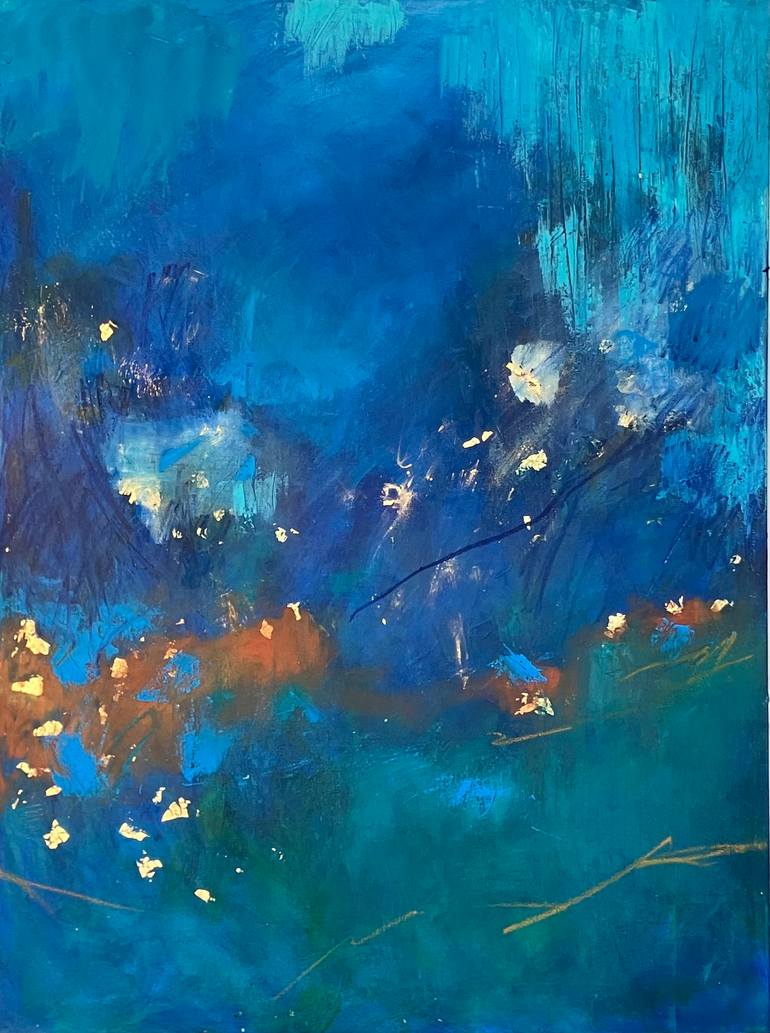 This painting is the impression of a moment. The exhilarating energy of nature felt and then expressed on the canvas. Base layer is acrylic with oil over top so appears as a rich oil painting. Moments of gold leaf dance across the surface