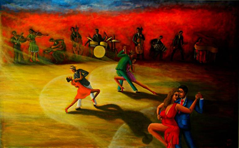 "Impression of dancing music" captures the vibrant energy of a dance festival as night descends. The air crackles with the music's vibrations and the dancers' spirited movements. Vibrant oil colors on canvas vividly depict the high energy atmosphere, channeling the musical band's rhythm and the dan...