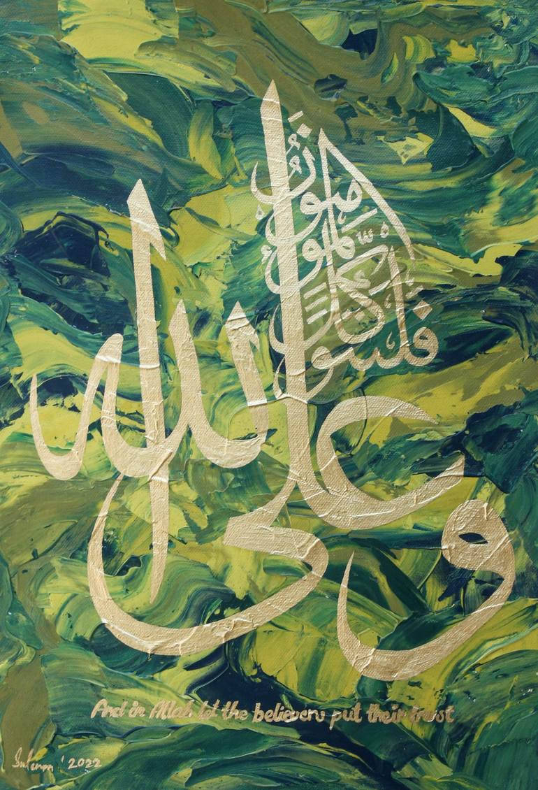 وَعَلَى ٱللَّهِ فَلْيَتَوَكَّلِ ٱلْمُؤْمِنُونَ Translation: In Allah let the believers put their trust” Holy Quran Surah At-Tawbah (Repentance) 9:51 Abstract Islamic Arabic Calligraphy Painted with premium acrylic painting finished with gloss varnish to protect against dust and uv rays