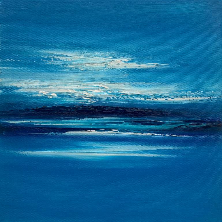 “In Deep Water" is a small 25x25cm oil on canvas abstract seascape painting on a 4cm deep canvas. Inspired by a watching the sea in Hastings on a beautiful Summers’s day It’s titled from Captain by John Phillips. It's painted in shades of blue with white. The paint is heavily textured in parts and...