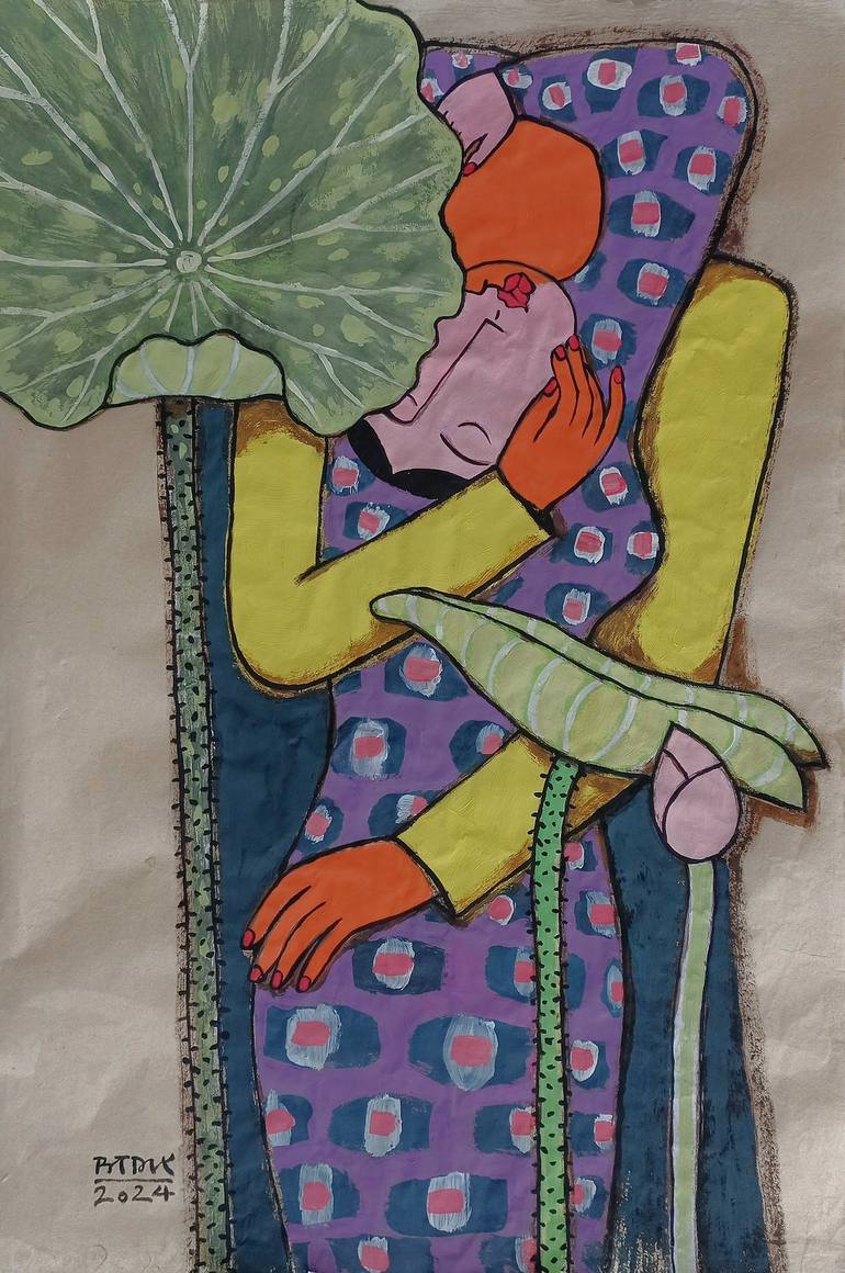 This painting is drawn on dzó paper. A type of paper handmade from the dzó tree. In this piece, I've woven a tapestry of human connection and natural serenity through the rich textures of gouache. My use of vibrant, rhythmic colors and the intimate pose of the figures amidst lush foliage reflects a ...