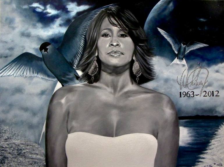 Acrylic painting on canvas of the late, great Whitney Houston, who was one of my all time favorite singers. This was an emotional piece for me. I embellished this painting with flat crystal beads and glitter for her earrings.