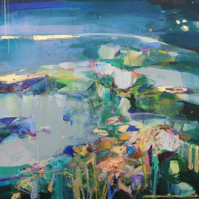 Looking with childlike wonder and curiousity at the glistening, playful forms of waterlilies in the light of the morning sun. This original, contemporary painting uses a combination of acrylic paint, pastel, gold and copper leaf on a 3.5cm deep gallery wrapped canvas. The painting continues around...