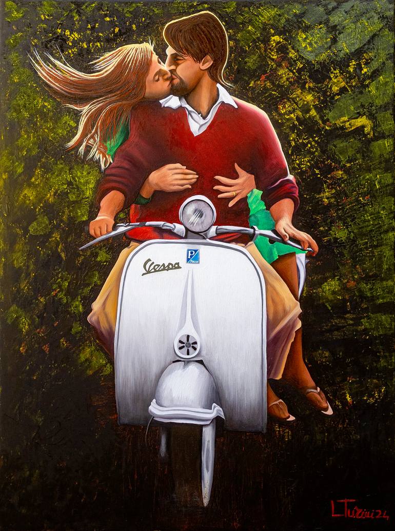 I am from Pontedera, which is the Italian town where the Vespa was created, and where it is still built. So I painted this artwork as a tribute to the Vespa and to my town. The contrast between the white Vespa and the dark background is inspired by Caravaggio and Baroque painting, and brings togethe...