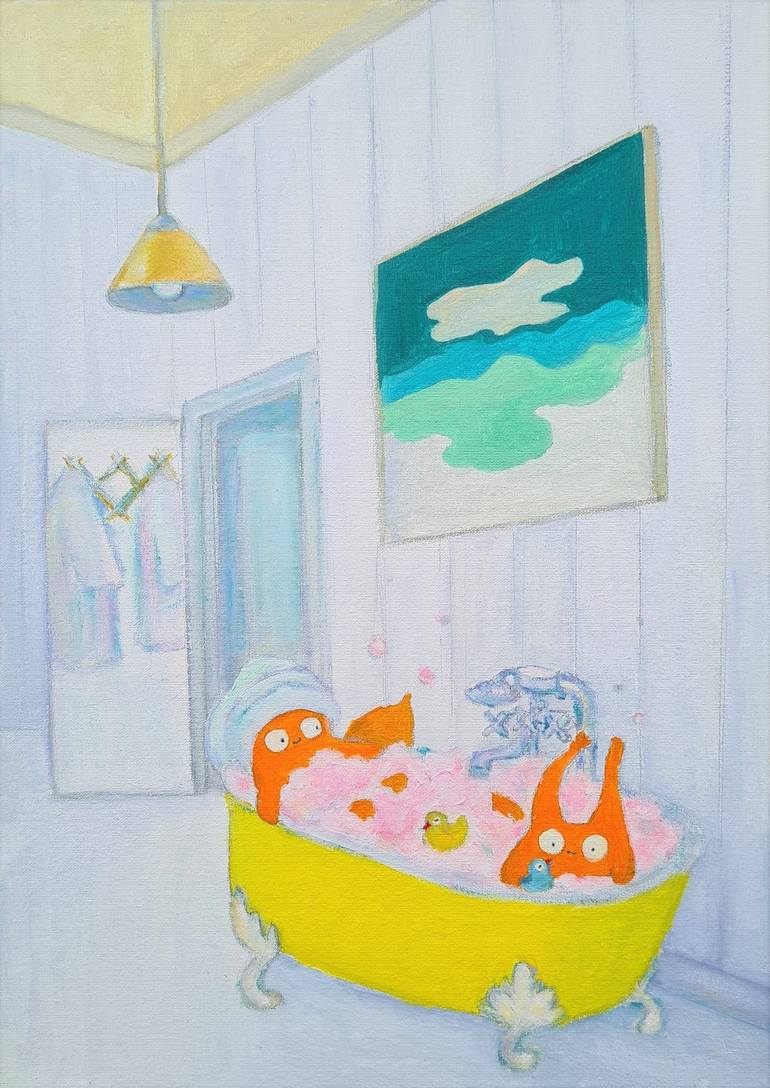 Painting:Oil on Canvas on cardboard You can always find relaxation and pleasure in very small things, like surround yourself with gentle and bright colors, take a bath with pink foam and ducks and listen to your favorite music :D