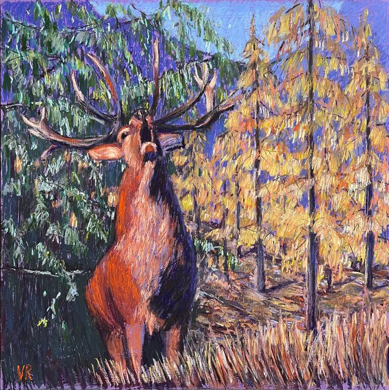 An unforgettable experience is visiting the Aletsch Glacier region in the Swiss Alps during the autumn reindeer rut. The painting is on the panel and ready to frame wit a glass protection.