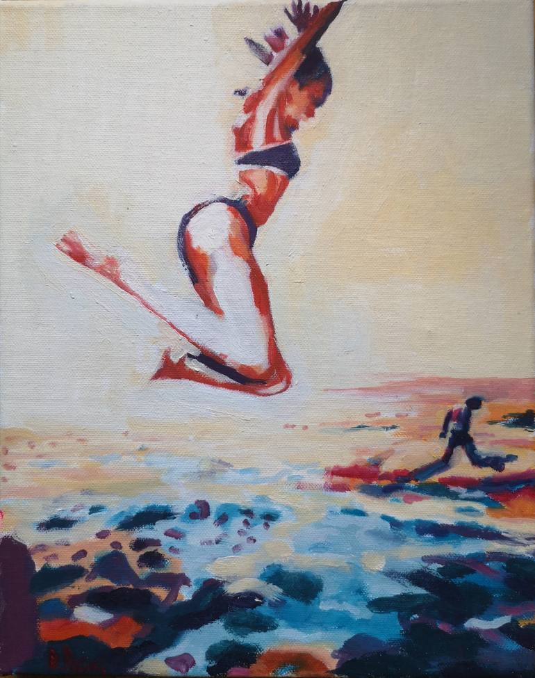 Continuing the series on the beach, in this painting the main subject is a girl who jumps and dives into the sea, on her right a figure of a man on the rocks.