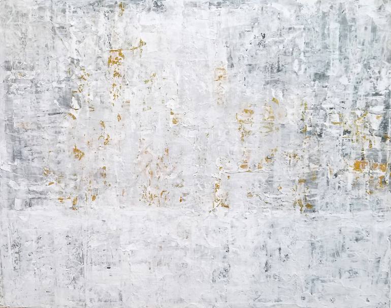 The softness of gray and white working on top of and underneath texture on canvas wraps shimmers of metallic gold in this minimalist painting making it compelling and calming at the same time. Metallic gold rises in sparkles from the paint horizon and dances in the texture of light gray and white. ...