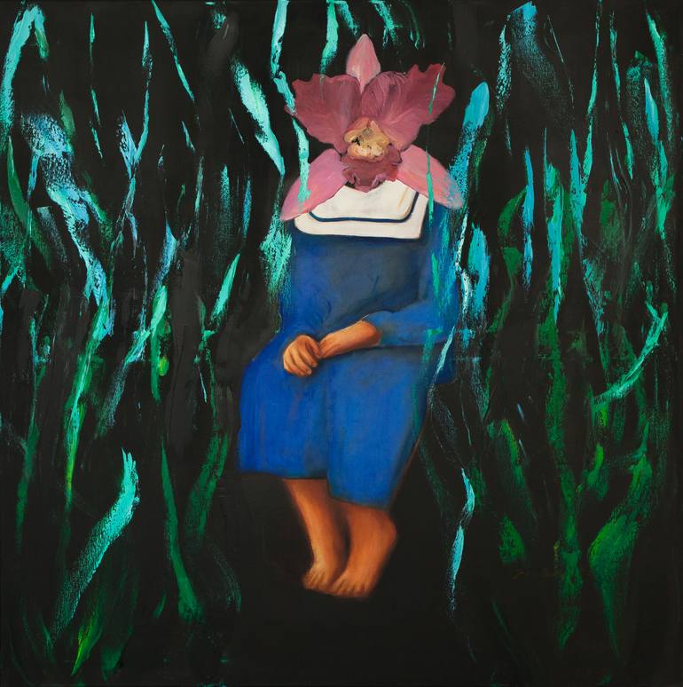 In the night garden - oil on canvas Obraz inspirowany twórczością Fridy Kahlo. Magiczny,pełen roślinności i tajemnicy jak młoda dziewczyna.