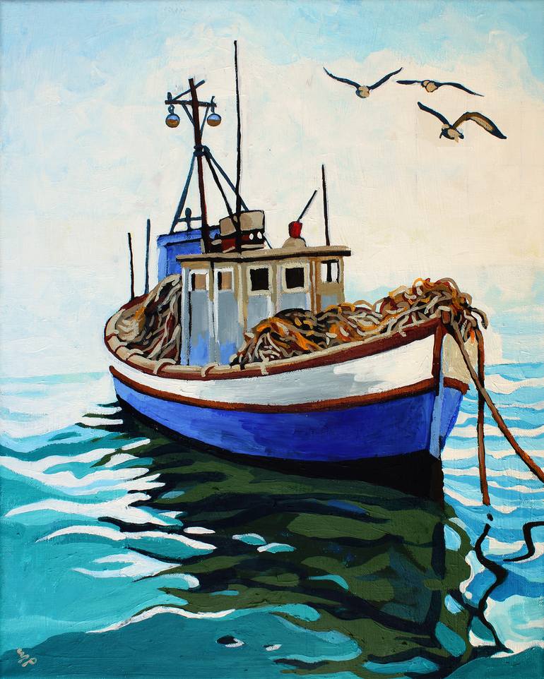 "Incoming" captures a peaceful maritime scene, depicting a shrimping boat gently floating on calm waters. Rendered in acrylic on canvas, the boat itself is a study in white and blue, accented by a warm brown trim. Fishing nets and essential gear are carefully arranged on the deck. The impressionist...