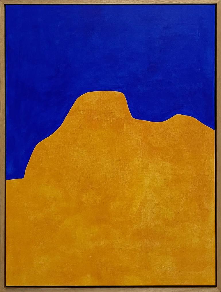 This minimalist and abstract painting is done in ultramarine blue and indian yellow acrylics on linen canvas. The painting is delivered framed with its floating frame.
