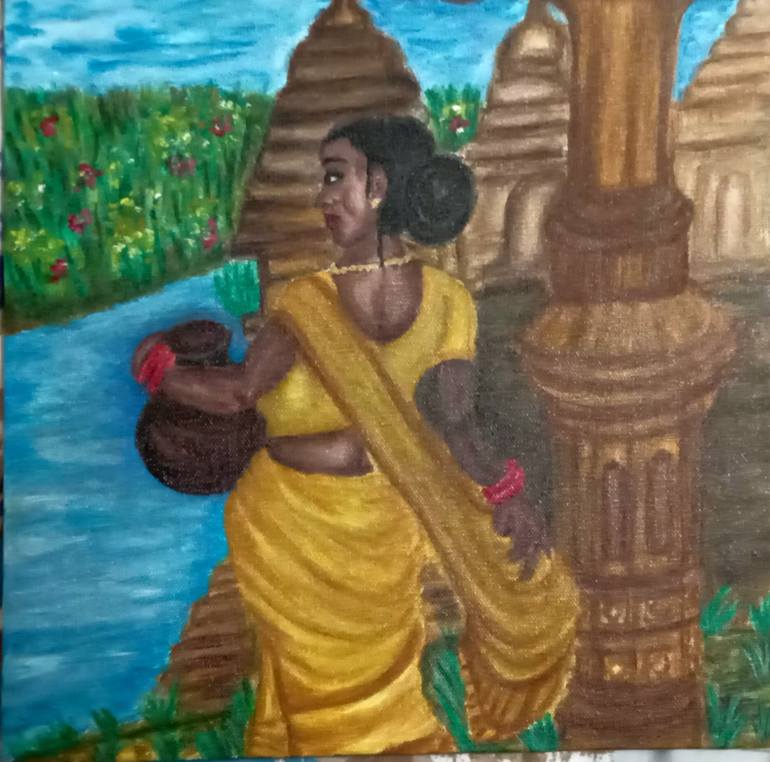 This is a painting of a woman carrying a pot with beautiful scenery. she walk in a place which is full of peaceful like Garden, water and temple. A yellow traditional Saree drapes her slender figure, in her left hand she cradles a sturdy earthen pot. Her dark black hair is pulled back into a ...