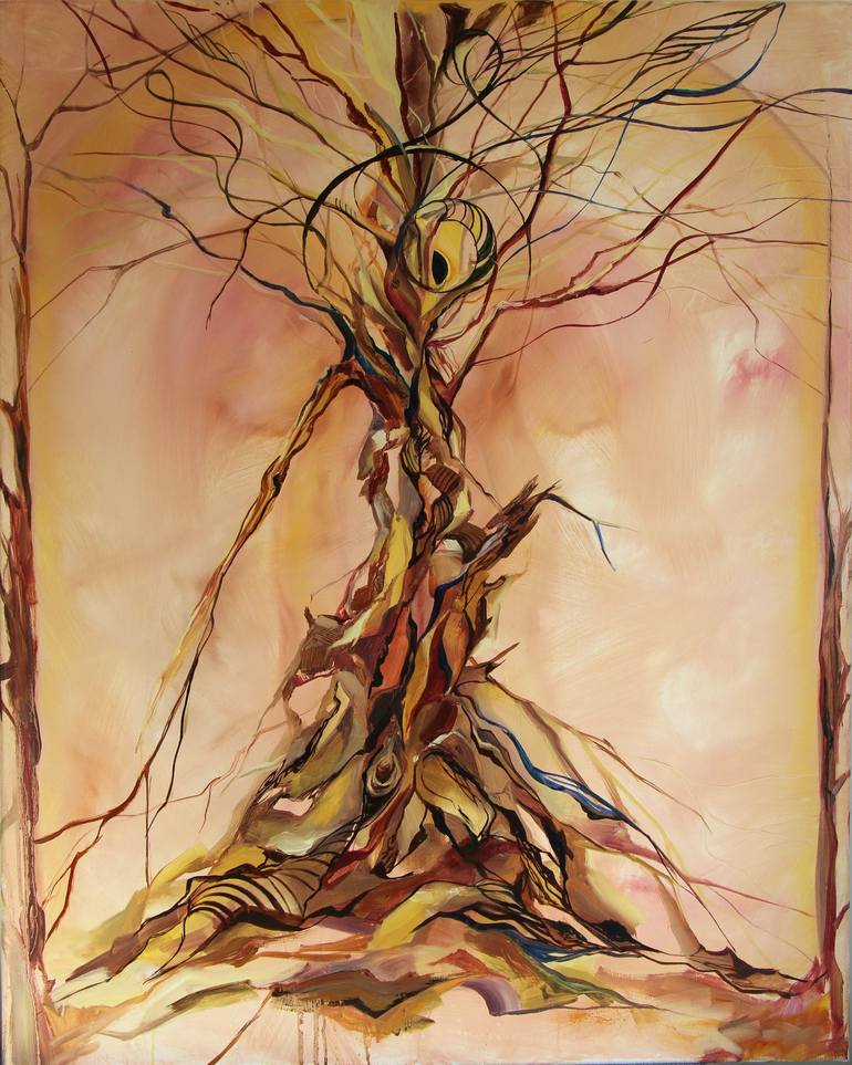 In Indivisible, human silhouettes subtly emerge within the form of a single tree, symbolizing our deep interconnectedness and shared roots. The warm palette conveys harmony and light, while fluid lines suggest growth and movement. Painted in oil on canvas, the work combines depth, texture, and atmos...