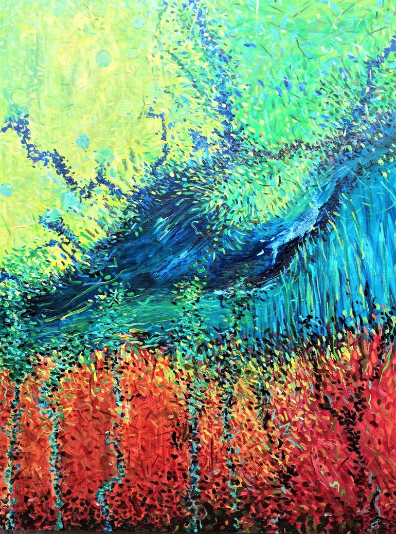 One of a series of paintings created with thoughts and "images" of the aftermath of a two brain absesses. Painted mostly with the left hand, my non-dominant hand) after some paralysis. Exploring the depths of the brain, into the completely unknown. Strong colour and strong emotions, areas feeding in...