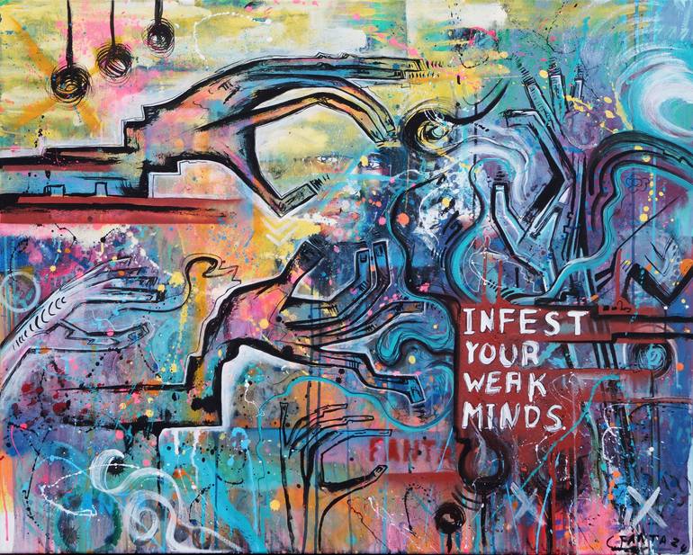 Am I a body or do I have a body? With eye-catching colours and different techniques of painting Captain Fanta creates expressive works. His abstract portraits allow most diverse emotions, while the eye of the contemplator is jumping from one edge to another. One time they are silent observers, the other time they tell you a story of their own world. You can find critical, philosophic trains of thoughts in his paintings and sculptures. For his art shall not just be decorative, but kick you and get your thoughts rolling.