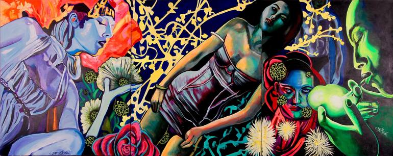 Walking into Christina De Musée's lavish studio in Palm Desert, CA is like being pulled into an artistic vortex of rich colors and fantastical imagery that pulsates with a dynamic life-force; a sensory feast. Her studio is also her home and a spectacular gallery that gives an entrance to Christina's private and exotic universe. De Musée emerged onto the art scene in the 1980's in Los Angeles, when securing a presence as an artistic talent was a tough road for women. Early on, De Musée knew that she had to incorporate her magnetic persona into the marketing of her art, drawing attention through theatrical spectacles and flamboyant promotional events. This controversial approach to showing her art gained her attention of Hollywood celebrities, the media and prominent art collectors. The critics took notice and a star was born. Christina continues, "My latest series is an aggregation of different themes, the mystical, the powerful, the vain, the decadent, the transcendent and, of course, the humorous and sexual aspects all thrown together into wild compositions." Some of these paintings are stimulated by the hidden and not so hidden social events of the desert. Works such as "I Kiss You Electric" and "Secret Garden" are an exploration of these themes. De Musée's artwork overflows with vibrancy, theatricality and a memorable cast of characters. Sometimes labeled as outrageous, provocative and shocking, the artist's work is unique and unforgettable. It is fun, it is daring - but it is never grim, much like the artist herself. All of Christina's artworks are personality driven. She has a passion for life and that passion infuses not only her work but every other aspect of her life. Christina enthusiastically explains her calling by saying, "Art is a drive and a compulsion. It is like plunging into a fast moving river and as the ideas come rapidly, like a torrent, they must be acted upon or lost forever. This is why I like to paint two or three paintings at the same time. With my work, people are getting a lot more than just a painting. The art collectors are getting a full panorama of mood and presence. My mother used to bake what was called a 1,000 layer cake and that is the essence of my art. The content is rich and layered with many visual tastes." Christina De Musée uses diverse subject matter to create a collage of disparate images that foster a visual story that teases the mind.