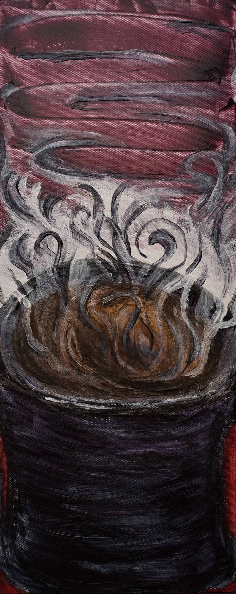 Thoughts are swirling. Steam is water. Coherent, clear water stained by involuntary submergence nevertheless remains a pure essence. The self exists in many phases and through many experiences. Acrylic with gel mediums on reclaimed mounted canvas. Techniques using palette knives and brushwork shadi...