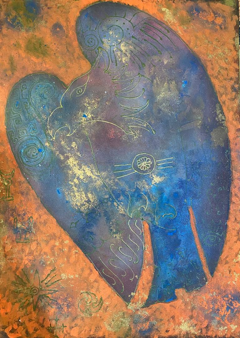 This painting portrays an abstract form of a mythical bird, emerging from deep blues and purples against a warm, earthy background. Intricate lines inspired by indigenous art and ancient symbols are woven into the bird’s figure, as if each one holds a forgotten tale from distant times. The rough tex...