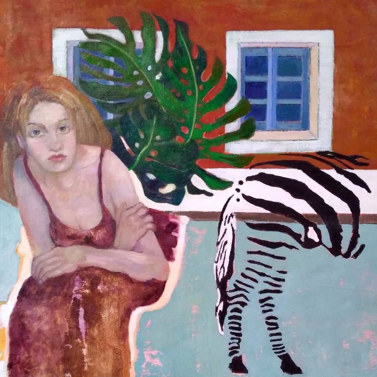 Painting : Oil on canvas. a woman is sitting in the foreground, looking at us, but if you pay attention, you realize that she’s actually lost in her thoughts. Around her we perceive images of scenes lived or dreamed, out of his imagination. Oil painting on linen canvas stretched. The painting "wrap...