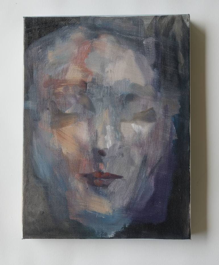 This piece is part of a series of small oil paintings of faces with closed eyes. As a yoga teacher, I see faces in this way frequently during the final posture of svanasana, or corpse pose/ relaxation. These faces contain the beauty of inner ease, the softness of peace sensed within, the hope of pea...