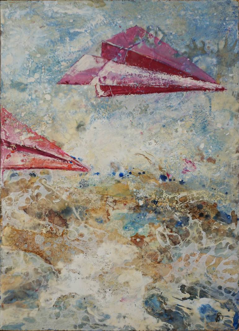 This is a unique, original encaustic painting of the Innocent Games series, a work designed to express infinite space through colors, materials, and textures. This series forms a transition between figurative and abstract painting. Cheerful spots of colorful paper airplanes in abstract space, what s...
