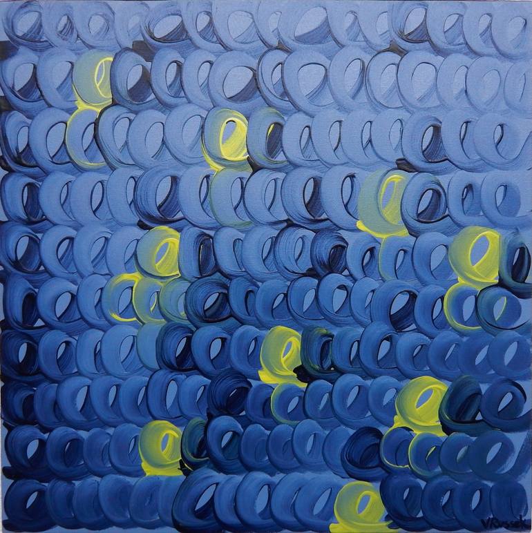 Abstract artwork inspired by fireflies coming out at dusk, just before night sets in, done from a calligraphy writing exercise point of view. Gallery wrapped canvas, sides are painted.