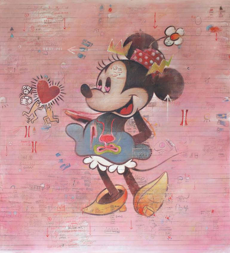 Minnie Mouse oil painting inspired by Jean Michel Basquiat. Size: 82 x 98cm on wood panel with black float frame.