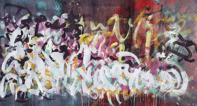 Layers of graffiti-inspired color washes with deep base colors of red, purple and blue with tracks of deep purple and white over the top. The canvas is gallery wrapped, with the artwork continuing on the sides.