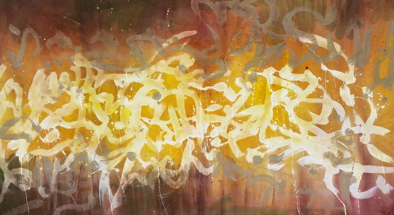 Part of a series, this piece is about memories, layers and movement. Layers of graffiti-inspired color washes with muted colors of gold, orange and red with tracks of white and grey over the top. The piece is gallery wrapped, so the canvas wraps around the sides of the stretcher bars showing the im...