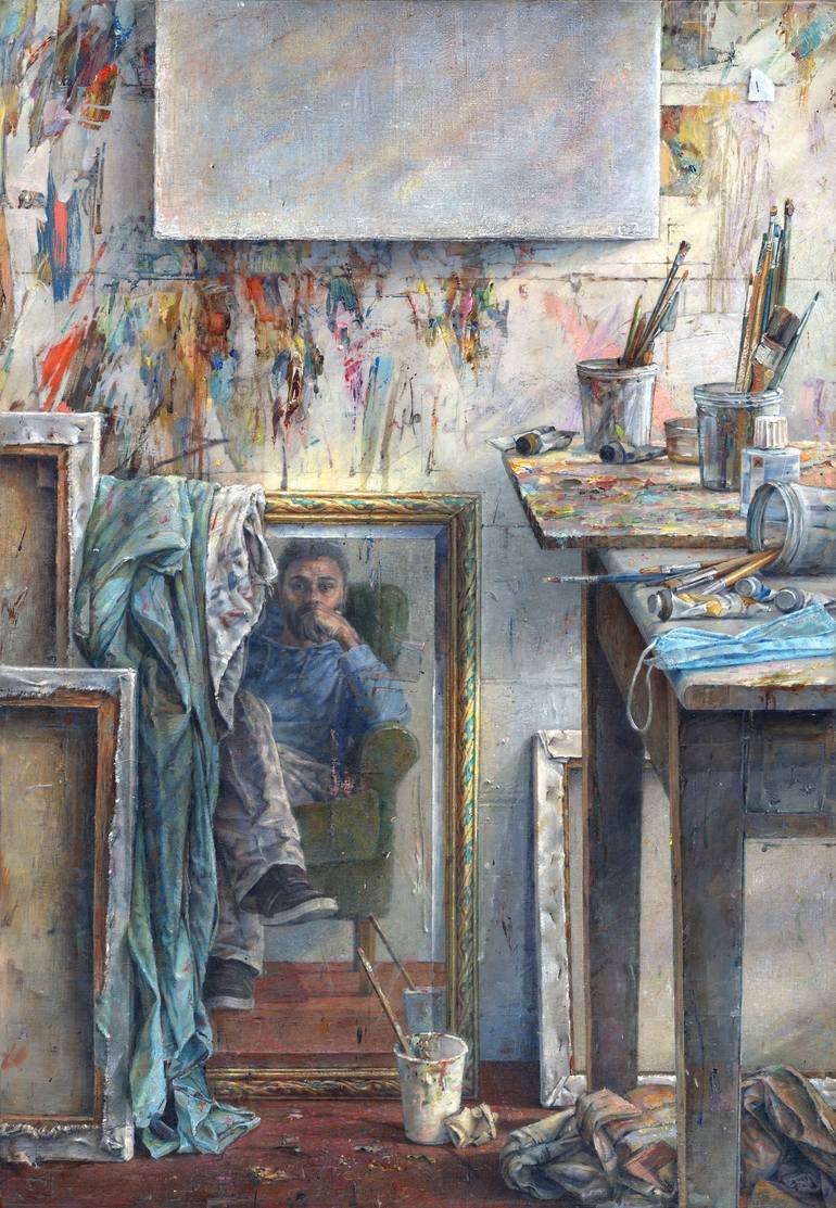 With this painting I wanted to reveal the inside of my studio space: a reflection of myself; a depiction of my work environment. Oil tubes, assorted brushes and dirty rags lie around, while stains and paint splashes speckle the wall. The studio is a place where I relax, think, and battle. I wanted t...