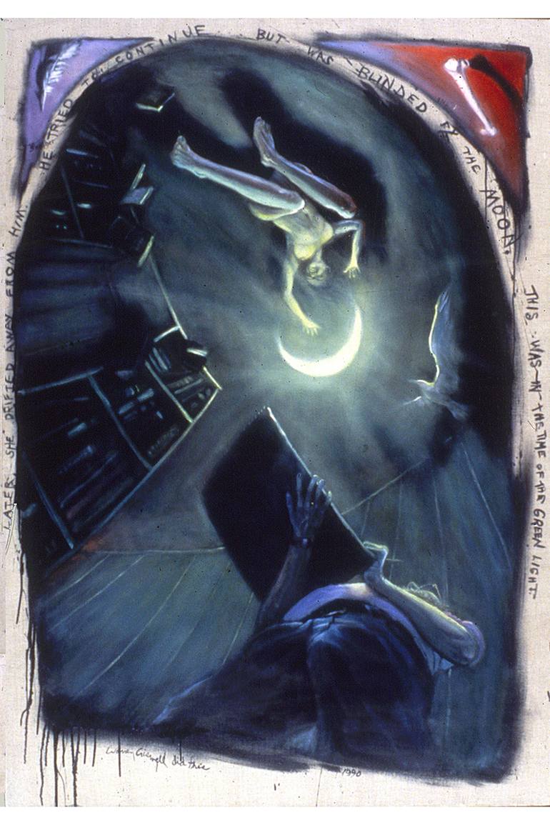 A feather for the sky, a bone for the earth? This the second painting of the triptych. The inscription reads, "LATER, SHE DRIFTED AWAY FROM HIM. HE TRIED TO CONTINUE . . . BUT WAS BLINDED BY THE MOON. THIS WAS IN THE TIME OF THE GREEN LIGHT." This one is set in my bedroom and the model is my wife. ...