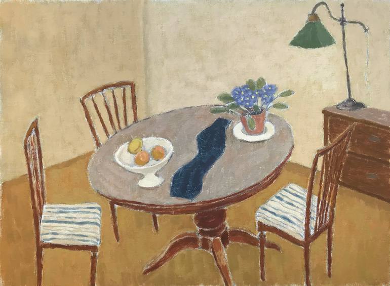 Painted from a sketch of the living room table. Oil on linen canvas.