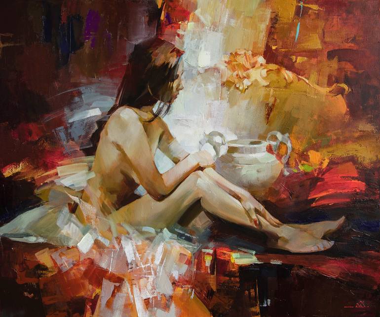 "Intimate ambience" is a sophisticated play of light, shadow and color that immerses the viewer in a world of deep experiences and tender loneliness. Warm shades of ocher, burgundy and golden glow create an atmosphere of comfort and harmony, and expressive strokes add emotional depth to the picture....