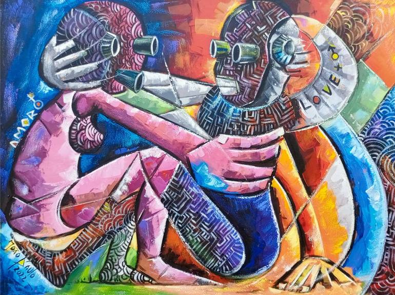 Pintura que retrata um momento de intimidade entre um casal no estilo africanista com traços variados e único