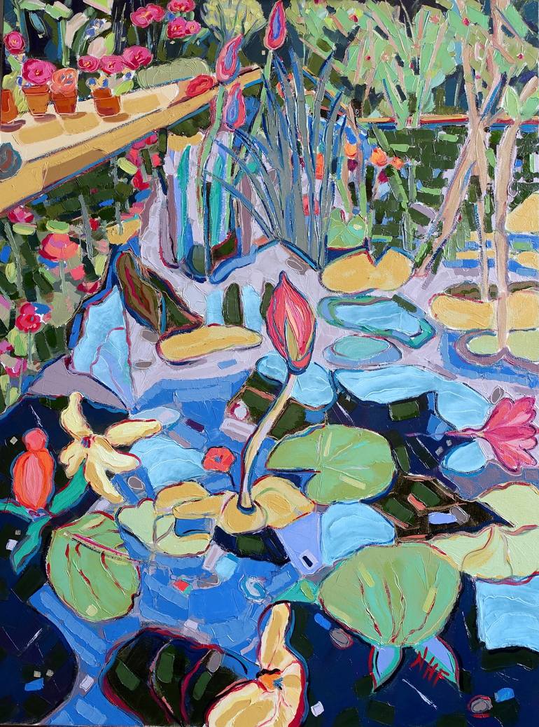 Another in the series of paintings from the Lily Pond in boca de Tomatlan, Mexico. I loved all the organic stuff in the pond, including the lily pads, buds, growth of other plants, water patterns..... Went with my philosophy that "More is More" for design!