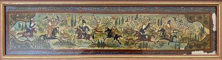 This painting captures a dynamic scene of equestrian hunting, set against a lush, detailed landscape filled with trees, flowers, and wildlife. The composition emphasizes movement and storytelling, showcasing multiple horse riders engaged in the chase. The vibrant colors and intricate patterns evoke ...