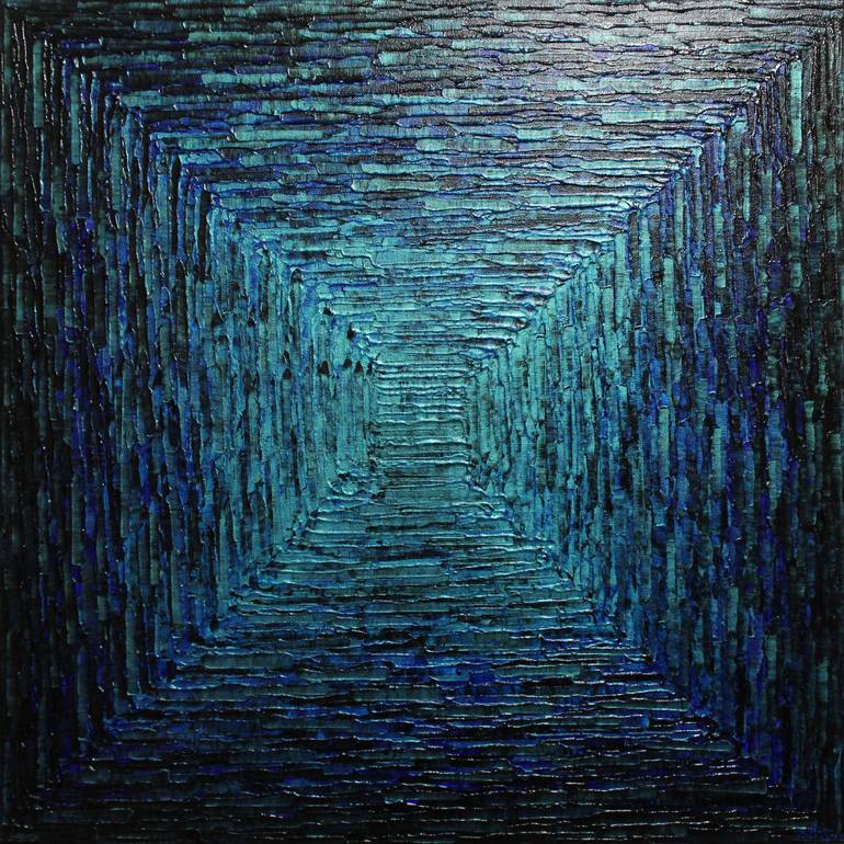 Contemporary painting: Iridescent blue square gradient. work done with a knife in acrylic paint on a wooden frame covered in cotton (100% cotton). Iridescent colors. Frame edges painted with black acrylic paint. Protection: work varnished with a shiny aerosol spray. To see a video preview of this ...